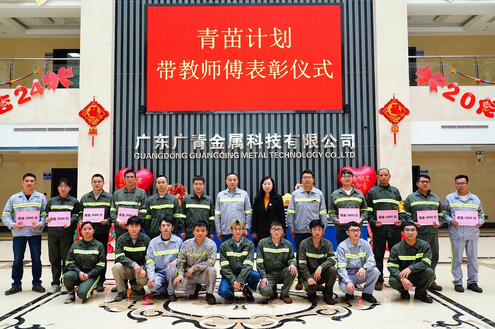 1月31日,广东广青金属科技有限公司青苗计划2023年度总结暨带教师傅表彰仪式在公司一楼会议室举行,公司党委副书记、工会主席王大庆,党委委员、常务副总经理刘光勇,相关部门负责人以及青苗计划师徒代表共25人参加仪式。