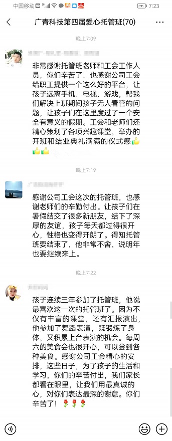 广青科技工会已连续四年开办职工子女暑期爱心托管班,帮助外地职工解决暑假期间孩子无人照顾的问题,切实为职工办实事解难题。托管班累计托管学生400余人,受到广大职工的一致好评。炼钢厂职工家长程礼军说:“感谢公司工会给职工提供一个这么好的平台,让孩子远离手机、电视、游戏,帮我们解决上班期间孩子无人看管的问题,让孩子们在这里度过了一个有意义的假期。工会和老师们还精心策划了各种兴趣课堂,开班和结业典礼也充满仪式感,孩子们很是喜欢!”熊哲小朋友已经第三次参加爱心托管班,熟悉的环境让他感到很开心,“在这短短的一个月里,我感受到了老师们无微不至的关爱,学到了许多新知识,拓宽了思维和视野,学会了责任与担当,也和老师、同学们结下了深厚的友谊,度过了一个快乐又难忘的暑假。”